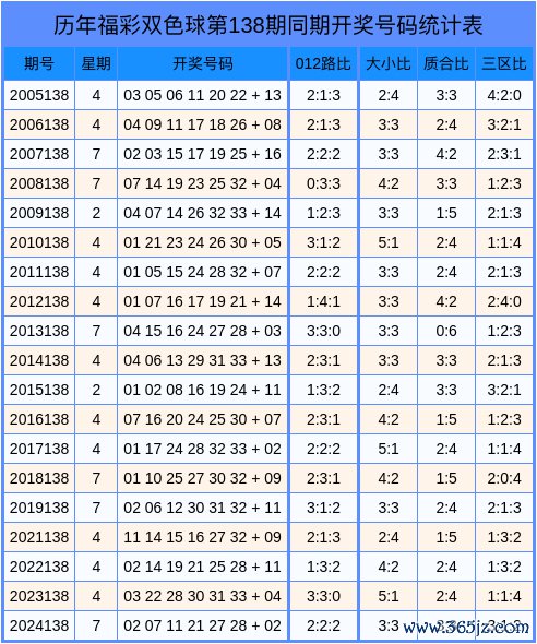 其中红球的012路比为1:0:5,三区比为3:1:2,大小比为3:3、质合比为4:2。
